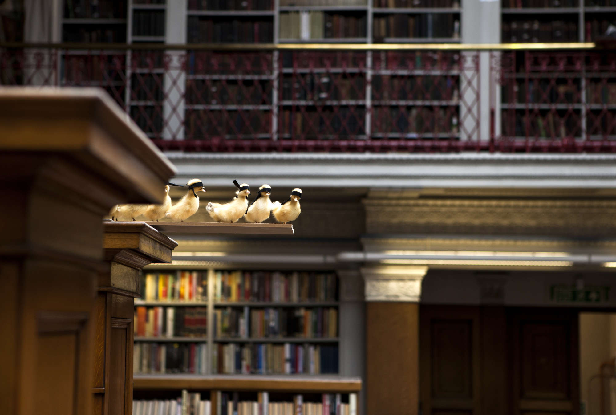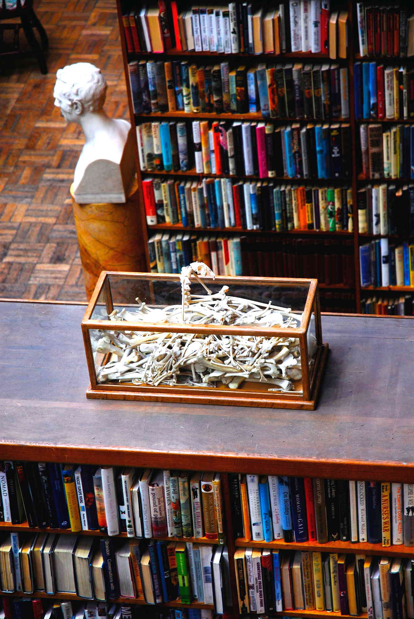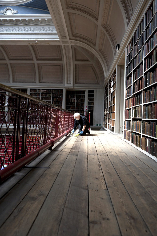 Swept gallery walkway for an hour, sometimes on hands and knees but mainly squatting so's not to get splinters. Wore face mask, apron and rubber gloves, got very hot and dusty. Interesting to think I have actually ingested some of this ancient and erudite dust, it has become part of the fabric of my being - if only temporarily, it does however make me feel quite sick and I can feel a headache coming on. As I sweep I note that Greek Mythology and the Biblical section are dustier than other sections, there is a damp stain on the floor near Social Sciences, Ethics gets a lot of sun and there are large gaps in the floorboards along the Spanish, French and German Literature sections. I am developing an affection for dust balls and also note there are some tiny book cover shreddings in my dustpan.